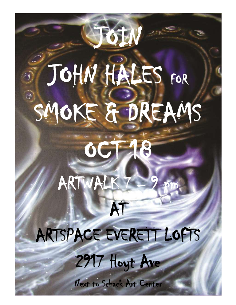 Artspace Everett Lofts – Artist John HaleOctober 13, 2018 in Everett Art Walk tagged 3rd Thursday / Art Walk / artists / Artspace Everett Lofts by everetta Join us October 18 from 7-9 pm at Artspace Everett Lofts, 2917 Hoyt Ave – next to Schack Art Center, for a once in a lifetime solo exhibition showcasing John Hales extra-ordinarily spooky airbrushed smoking skulls, custom tattoos and fine art.